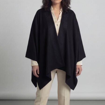 Cachemire doux, broderie ton sur ton, coupe ample, pour se porter au quotidien comme lors des occasions les plus habillées.
