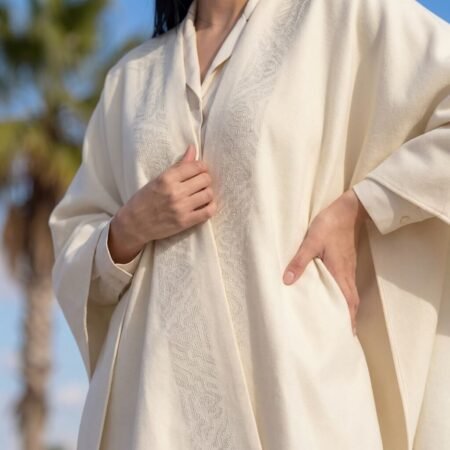La Cape Dynastia Camel célèbre la finesse du détail artisanal, elle est sublimée par une bande brodée au point de croix ton sur ton, travaillée avec précision pour créer un relief délicat et sophistiqué. Ce détail discret révèle tout le caractère de la pièce sans jamais en altérer la sobriété.