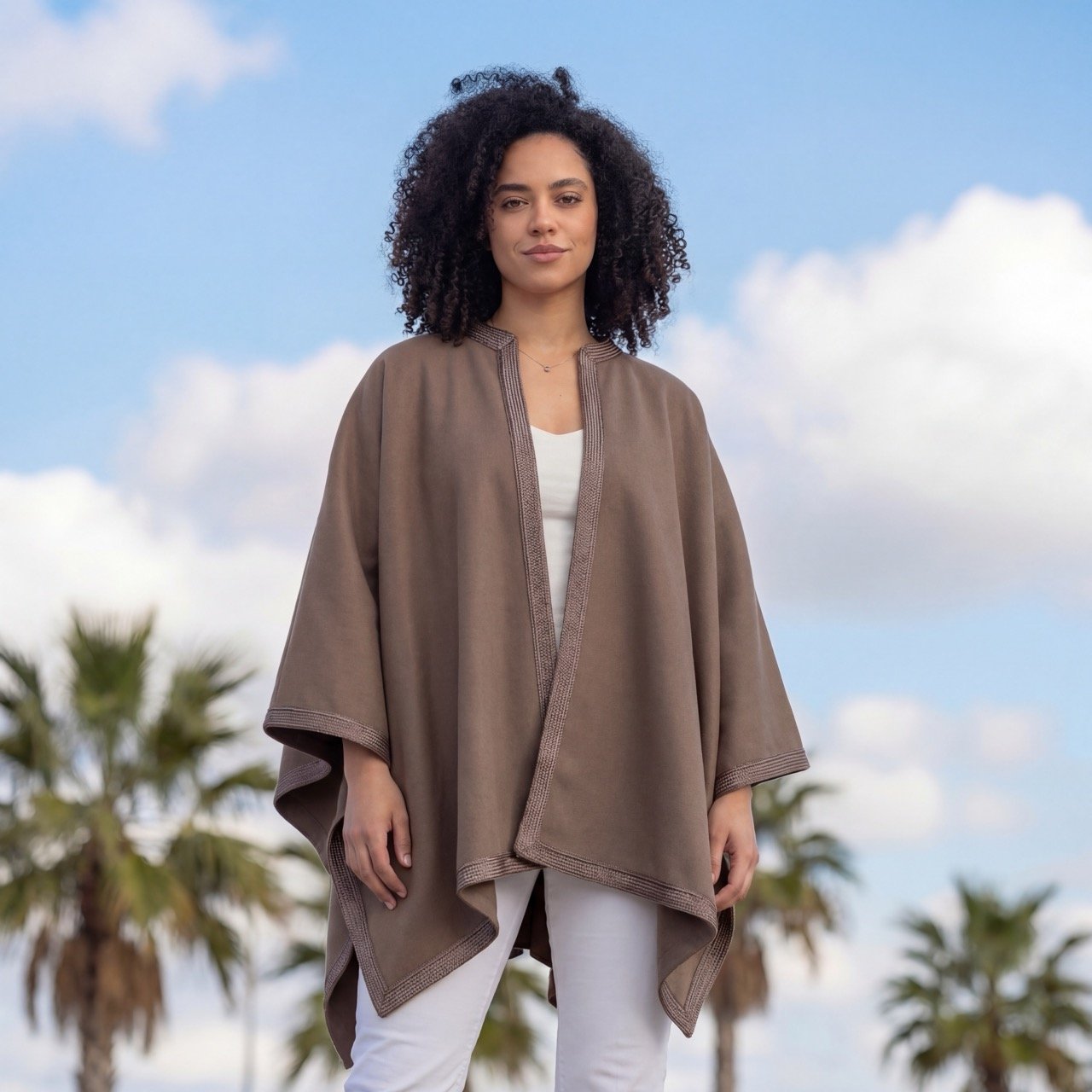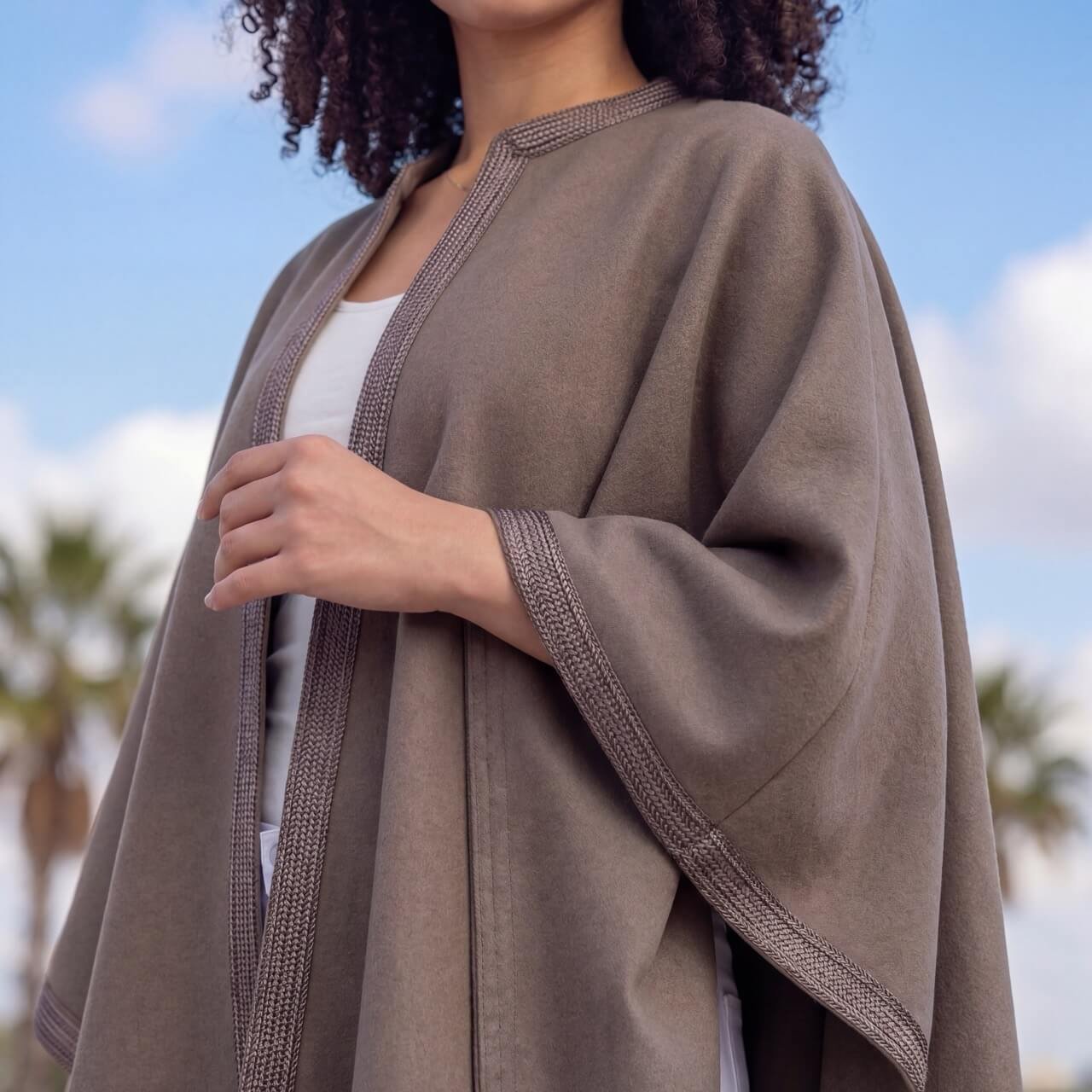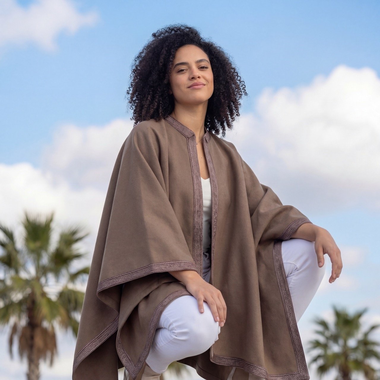 Cape enveloppante et naturellement sophistiquée, elle habille sans effort et s’ajoute aisément à une tenue de jour (jean, pantalon, robe simple) ou sur un caftan/jellaba pour les soirées et occasions spéciales.