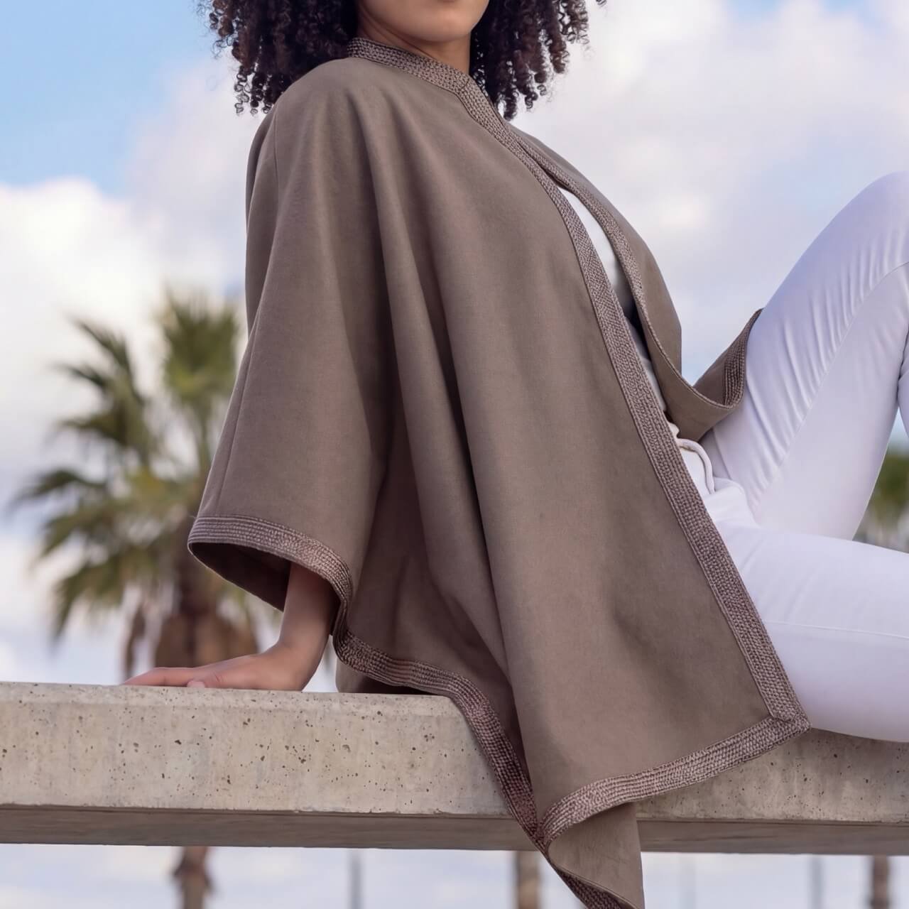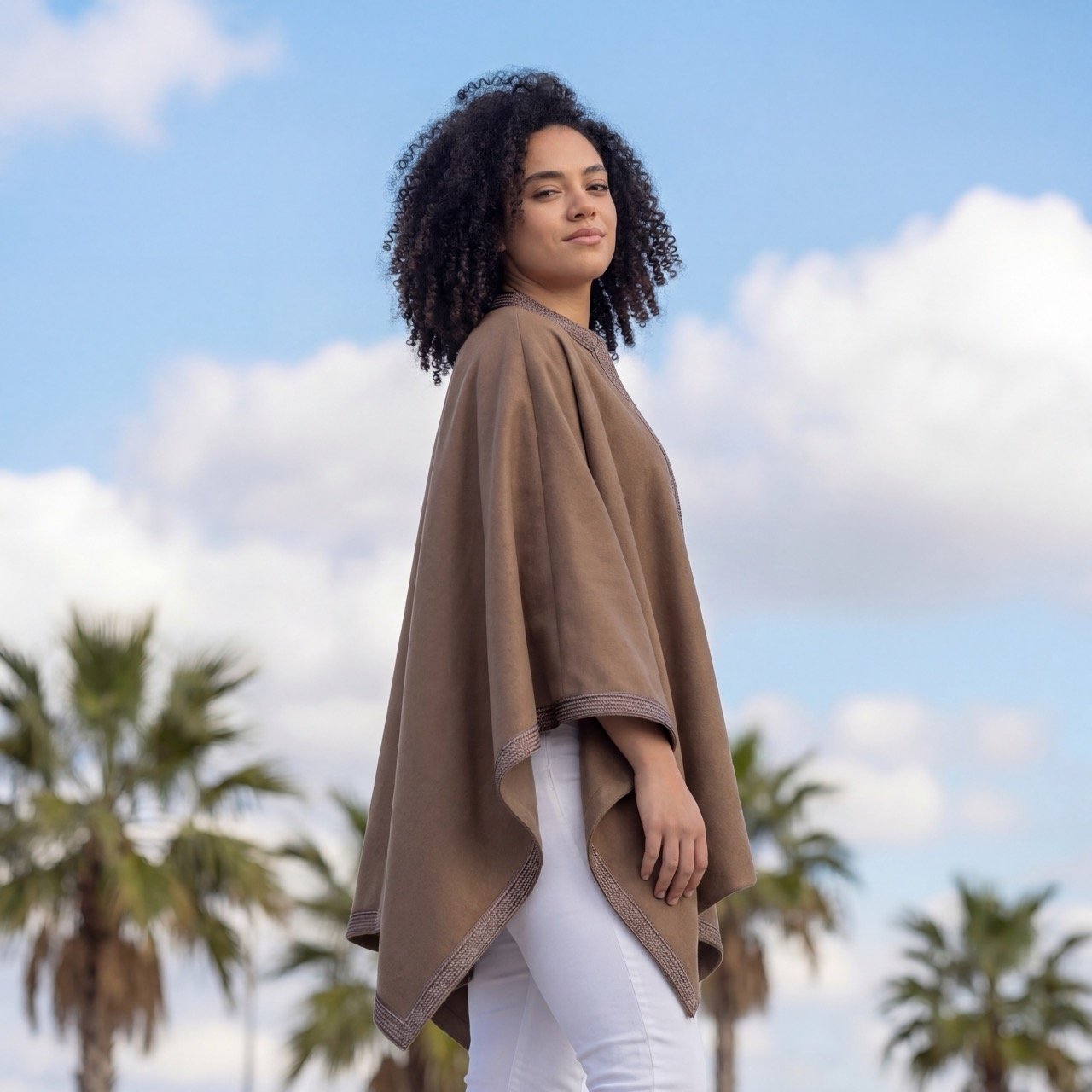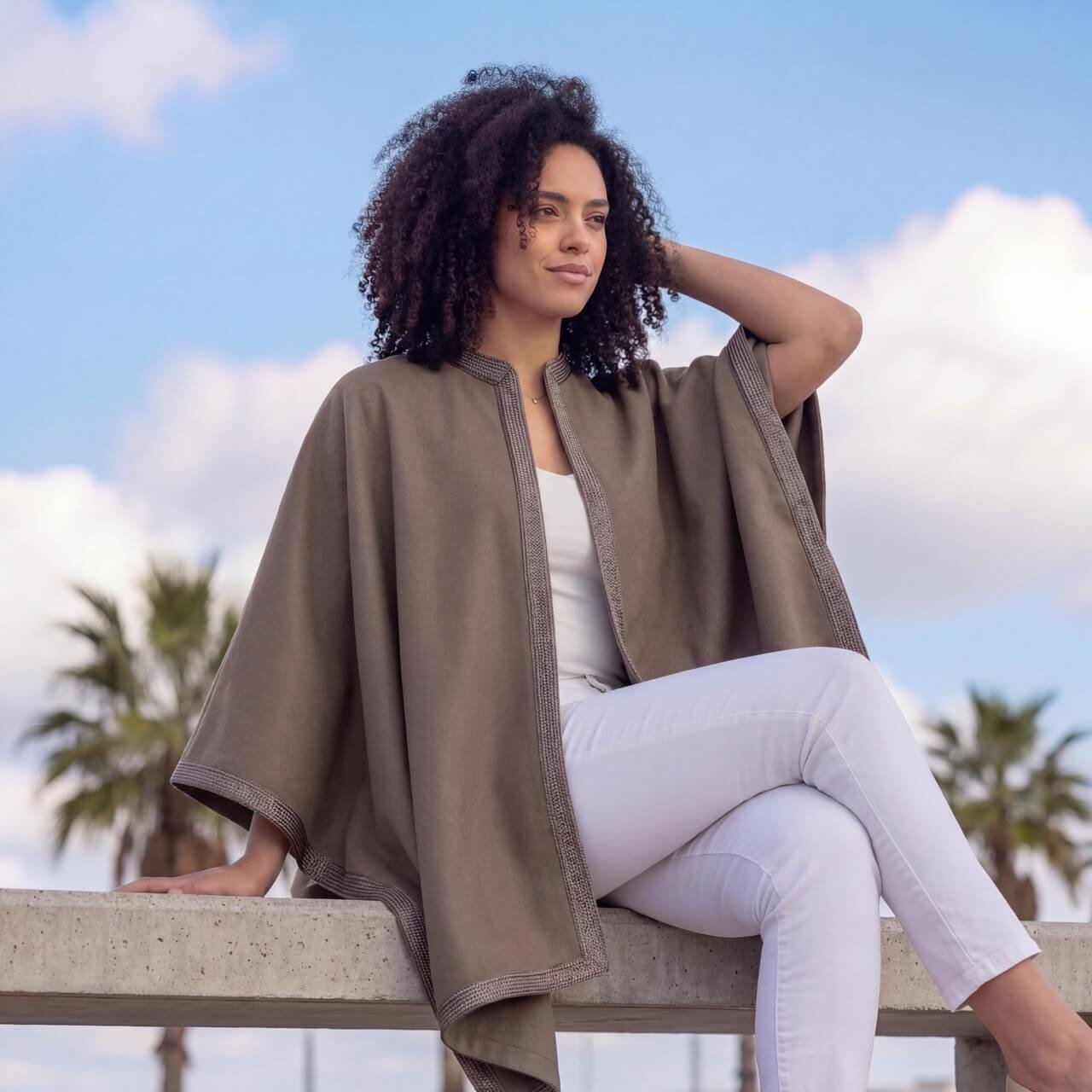 Cape enveloppante et naturellement sophistiquée, elle habille sans effort et s’ajoute aisément à une tenue de jour (jean, pantalon, robe simple) ou sur un caftan/jellaba pour les soirées et occasions spéciales.