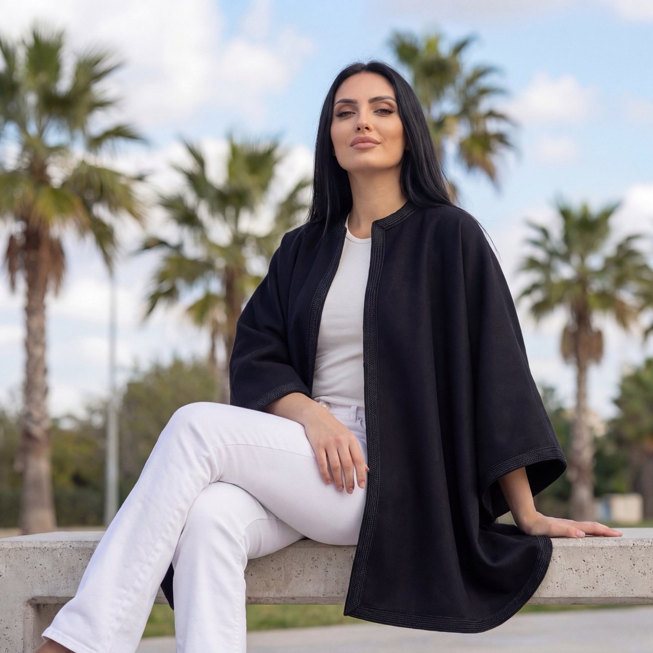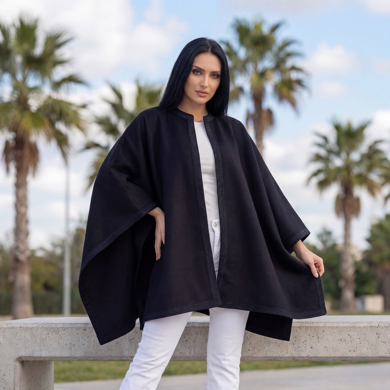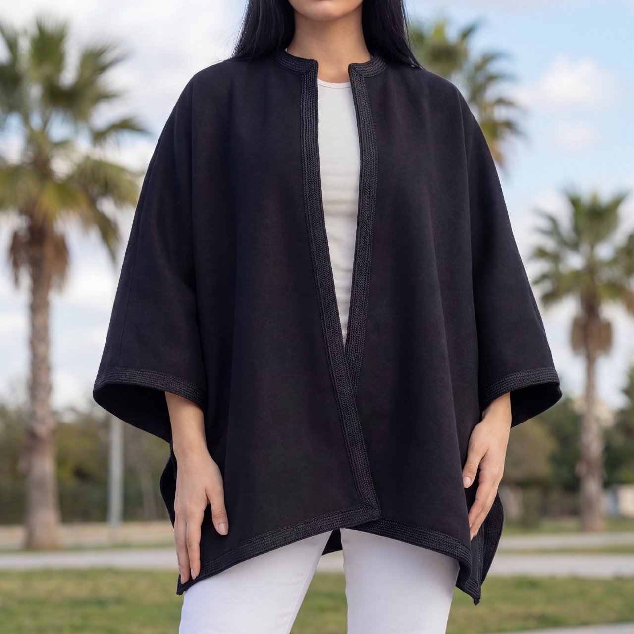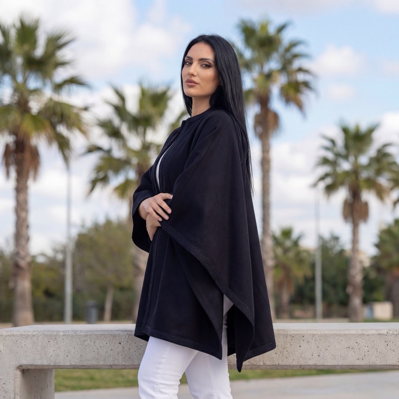 La Cape Impéria Noir incarne une élégance intemporelle où le raffinement artisanal rencontre la douceur du cachemire. Cette cape unie se distingue par sa finition sfifa ton sur ton, travaillée avec finesse pour sublimer la silhouette avec sobriété raffinée.