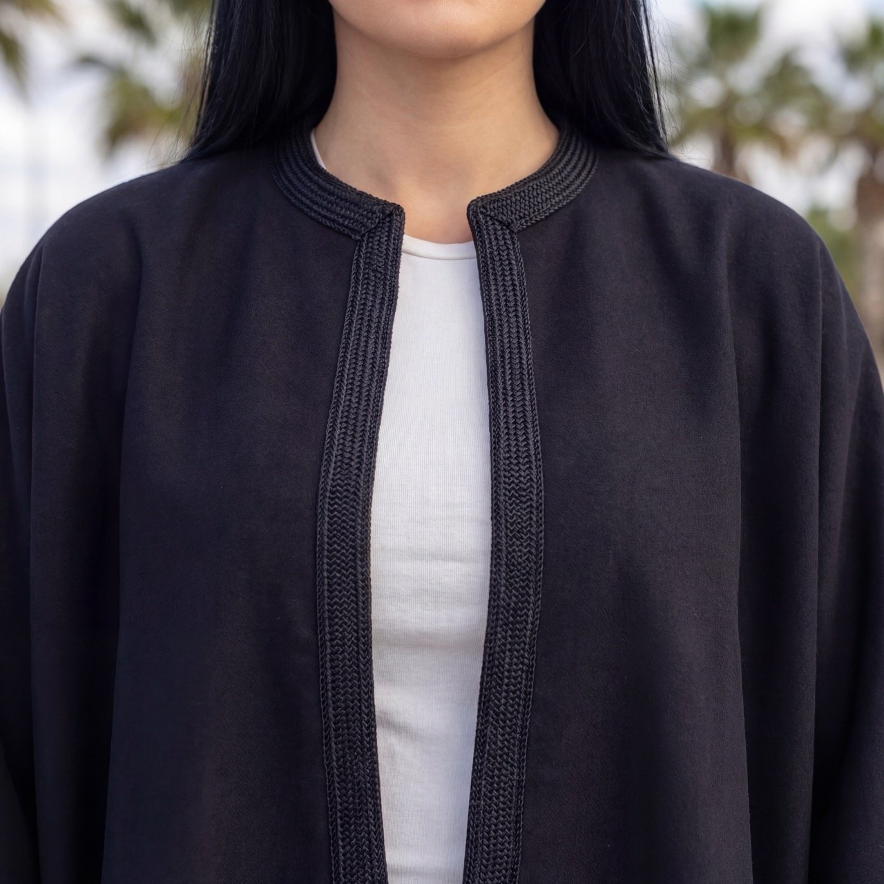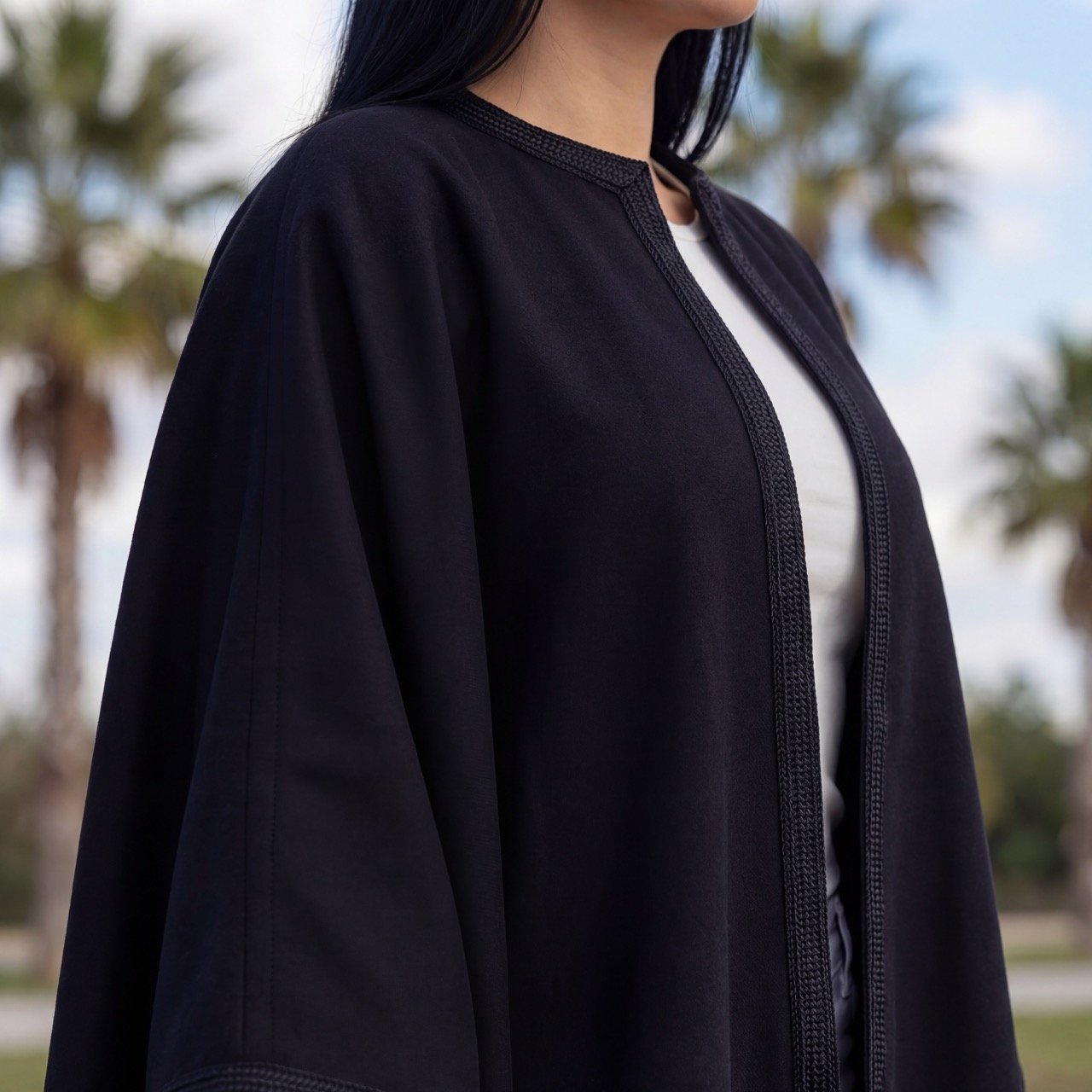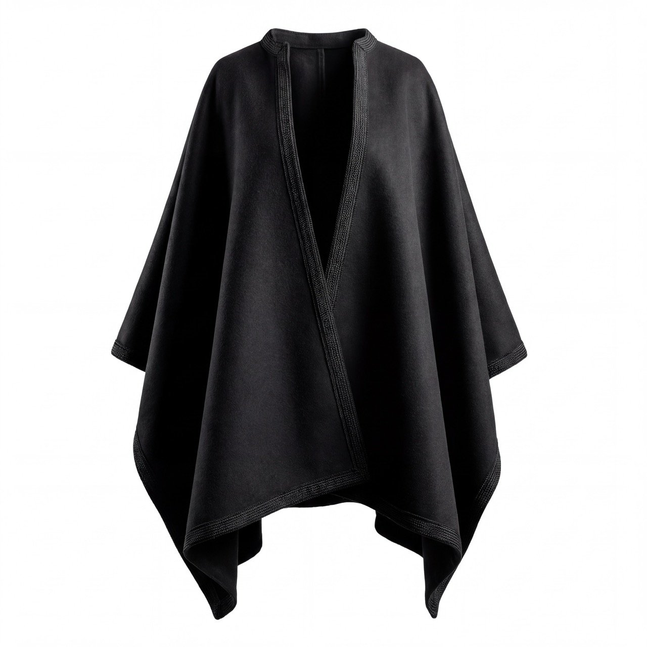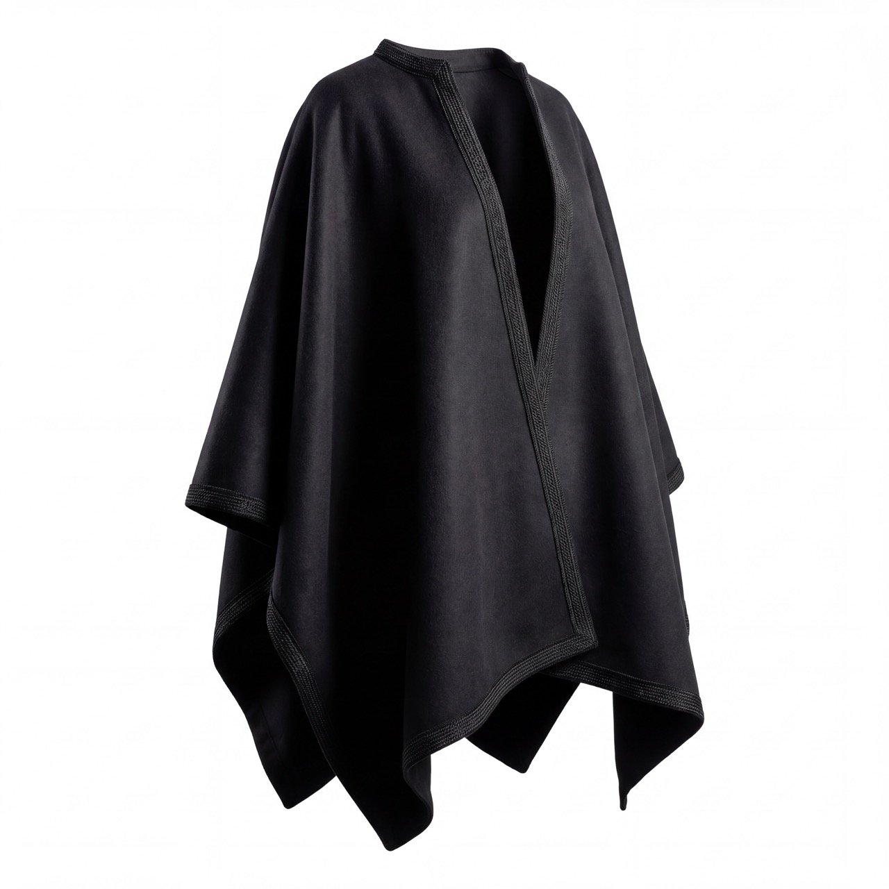 La Cape Impéria Noir incarne une élégance intemporelle où le raffinement artisanal rencontre la douceur du cachemire. Cette cape unie se distingue par sa finition sfifa ton sur ton, travaillée avec finesse pour sublimer la silhouette avec sobriété raffinée.